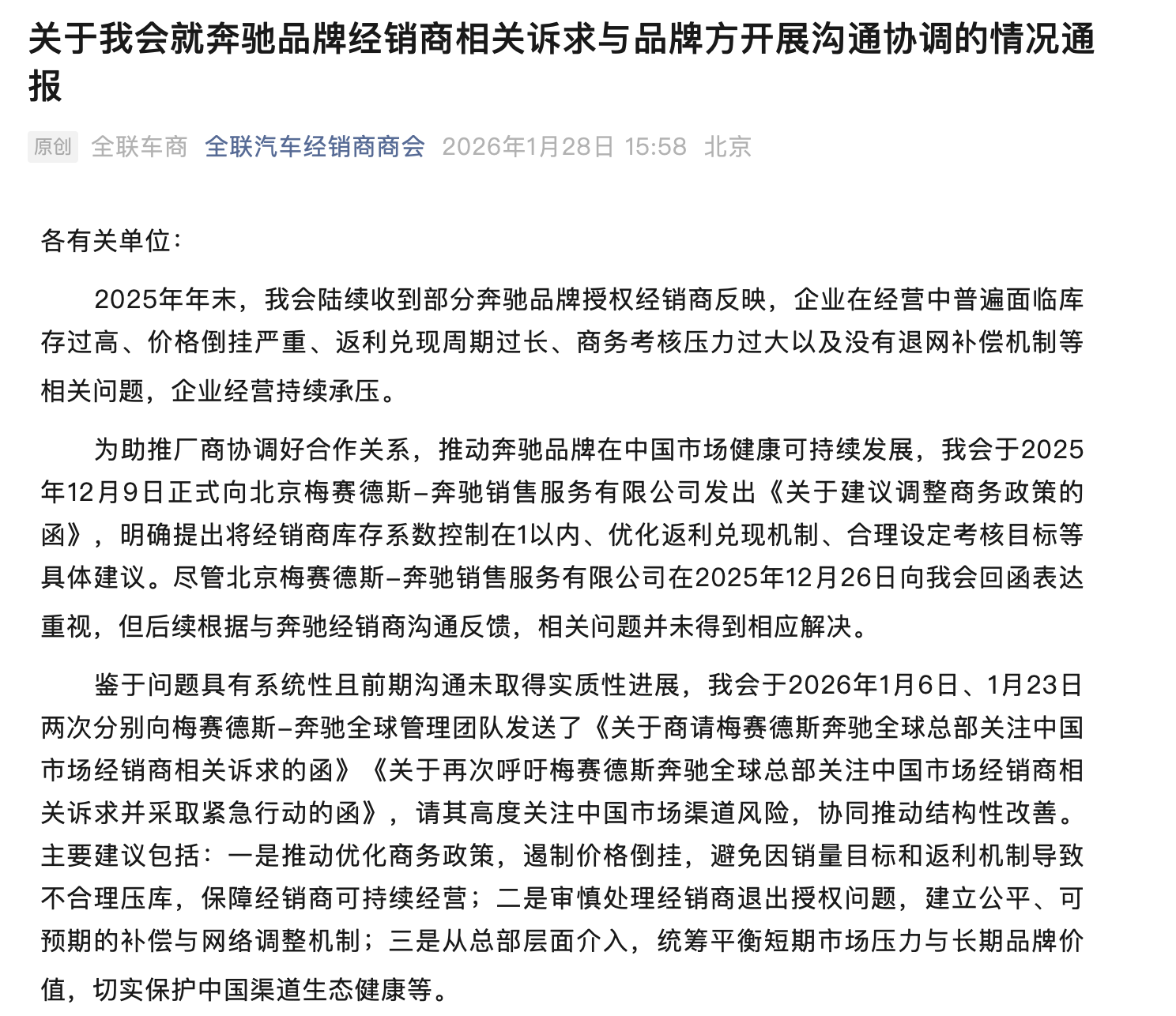全联车商于2025年12月9日、2026年1月6日、2026年1月23日三次、分别向北京奔驰、梅赛德斯-奔驰全球管理团队发函;2025年12月19日,中国汽车流通协会也曾向北京奔驰发函,并在此后的一个多月时间里,对全国不同地区奔驰经销商进行走访。